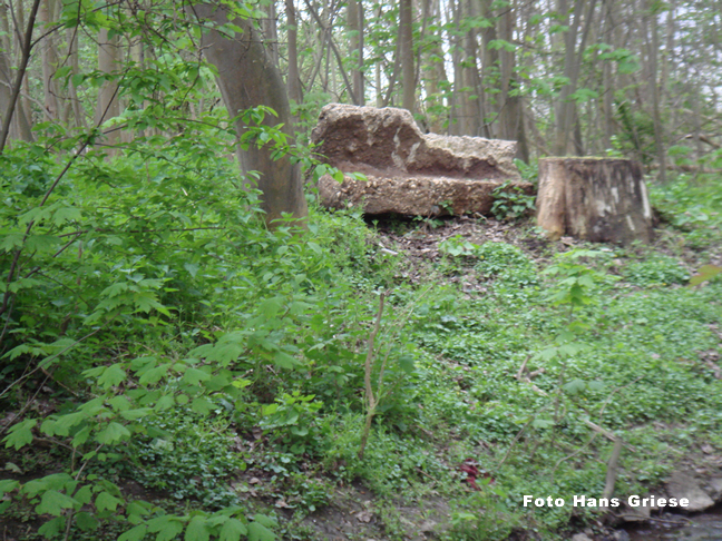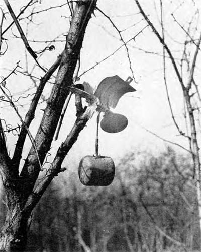 | Eine, im Baum hängen gebliebene, Schmetterlings- mine an der Erft bei Sindorf. | Container einer Me 262 für Schmetterlingsminen. |