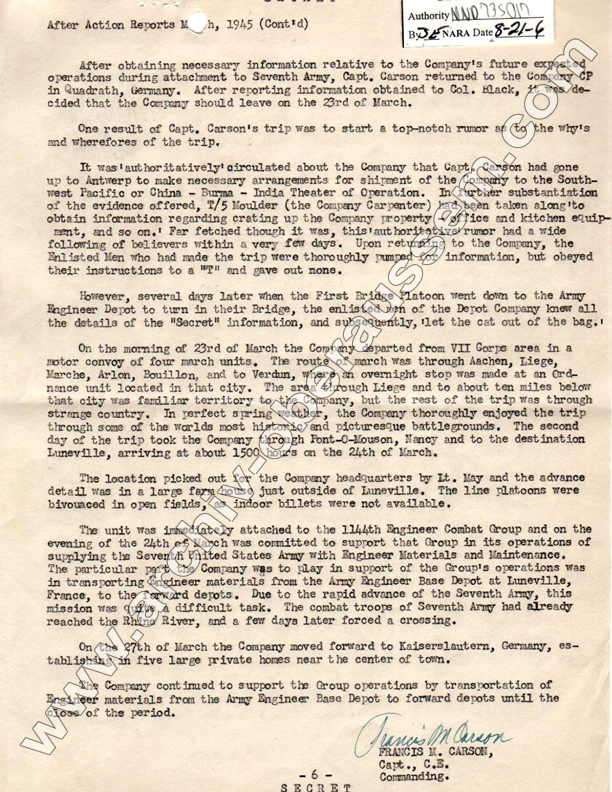 1-Mar-1945 237th Eng. C. Bn. Paffendorf, Germany Delivered an 80 ' DS Bailey Bridge and constructed it across the Erft Canal.