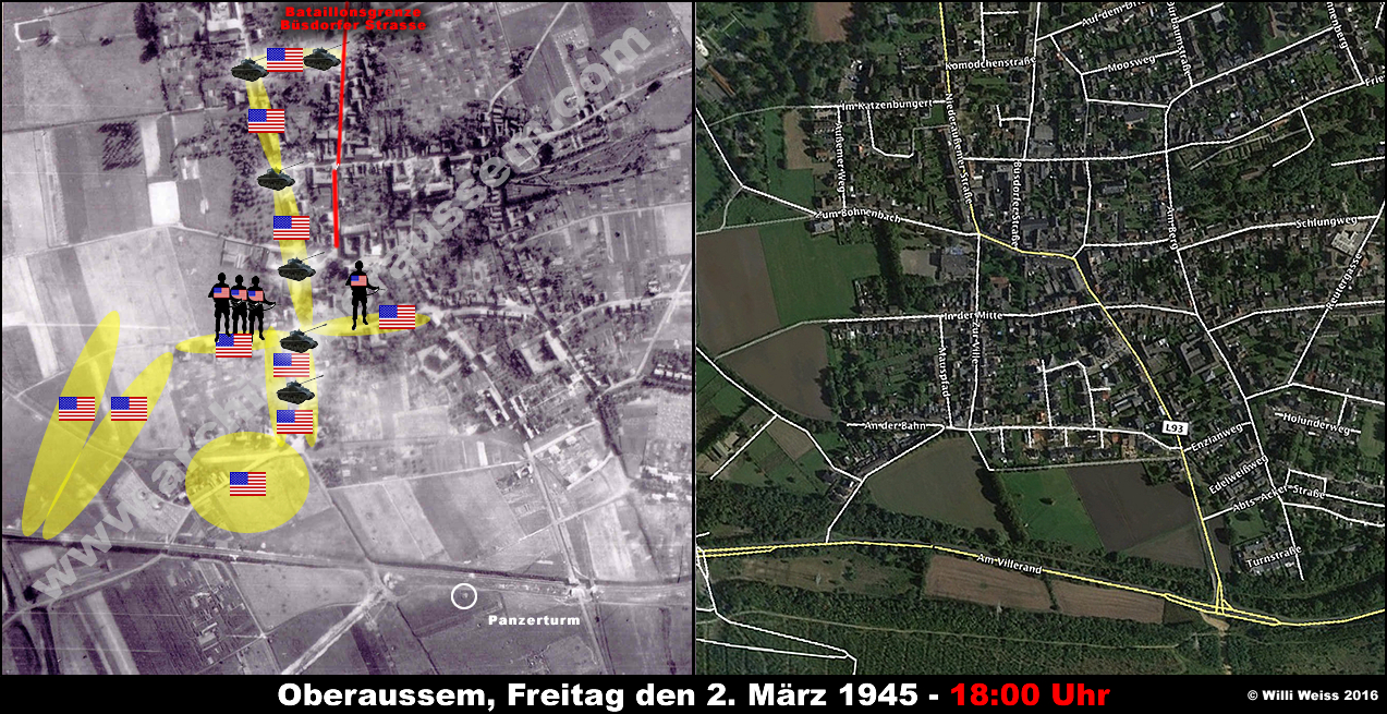 Zu diesem Zeitpunkt hatte die von der Hindenburgstrasse (heute Abts-Acker-Strasse) kommenden Teile des 1st Bn., 36th Armd. Inf. Regt. die gesprengten Brücken vor Oberaussem erreicht. Die Bewacher hatten sich widerstandslos ergeben und wurden später verhört.