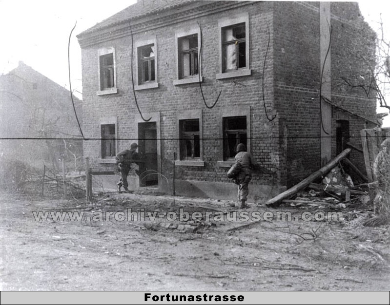 Als die Amerikaner um 16:30 Uhr die Ecke Fortunastrasse / Hindenburgstrasse (heute Abts-Acker-Strasse) erreichten, eröffnete ein deutsches Pak-Geschütz, das sich auf dem Feld zwischen Fortunastrasse und Kippe eingegraben hatte, das Feuer. Mit einem kurzen Schwenk nach rechts erwiderte der Sherman Tank das Feuer, wobei der erste Schuss das Pak-Geschütz verfehlte, der zweite Schuss schaltete das Geschütz aus. Das 1st Bn., 36th Armd. Inf. Regt. teilte sich an diesem Punkt auf. Ein Teil stiess weiter über die Fortunastrasse vor, der andere Teil über die Abs-Acker-Strasse in Richtung der Strassen- und Bahnbrücke der Bergheimerstrasse am Ende des Ortes. Dort hatten Soldaten vom Pionier-Bataillon 363 beide Brücken gesprengt um ein Vorrücken der Amerikaner vom Ortseingang Fortuna auf Oberaussem zu verhindern. Die Reste der Brücke wurden von deutschem Volkssturm bewacht.