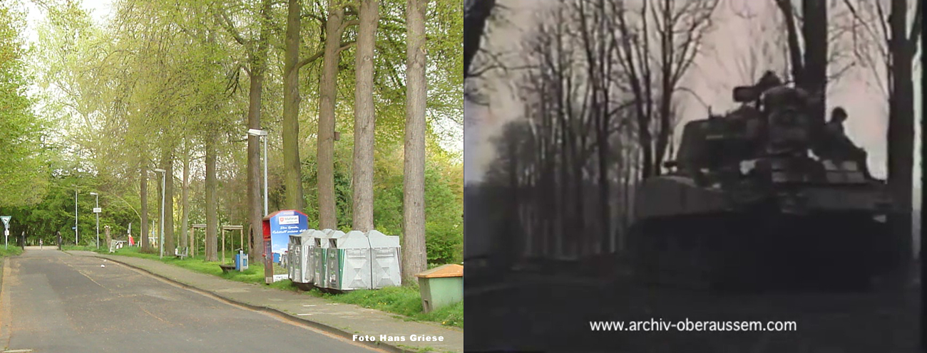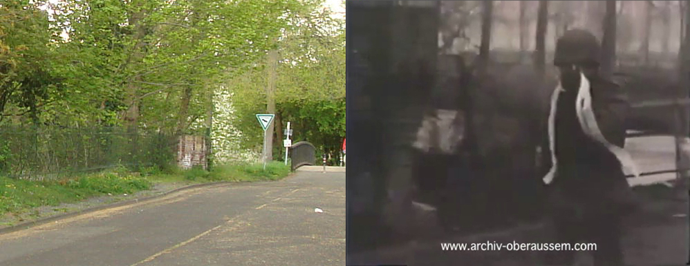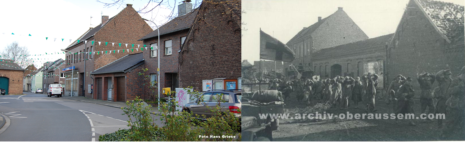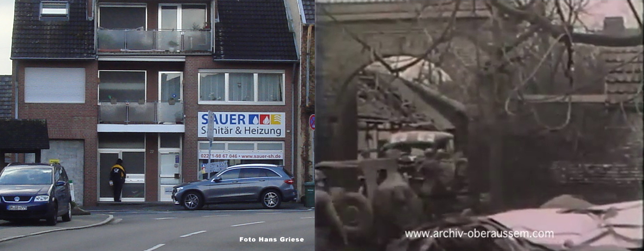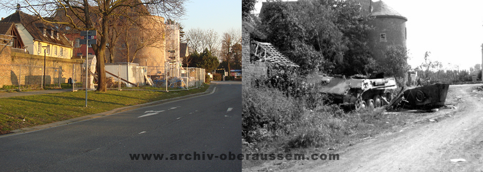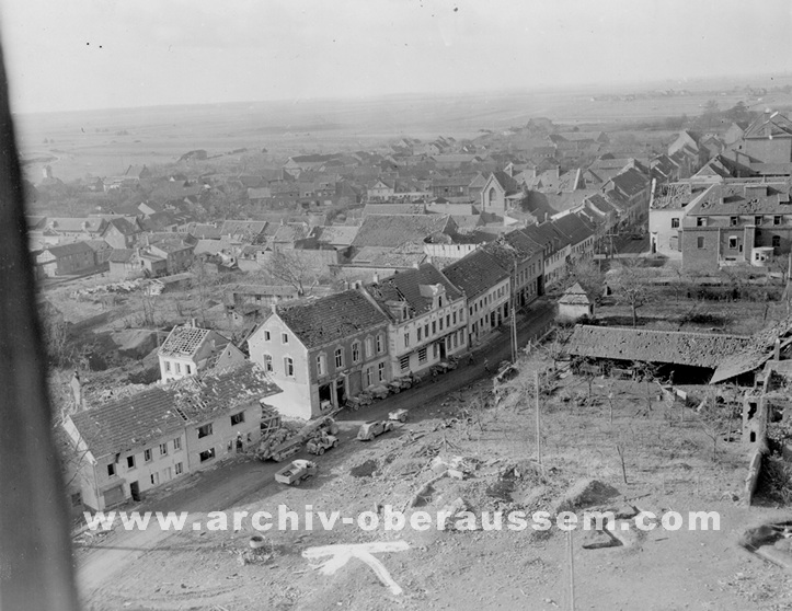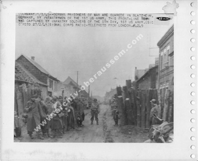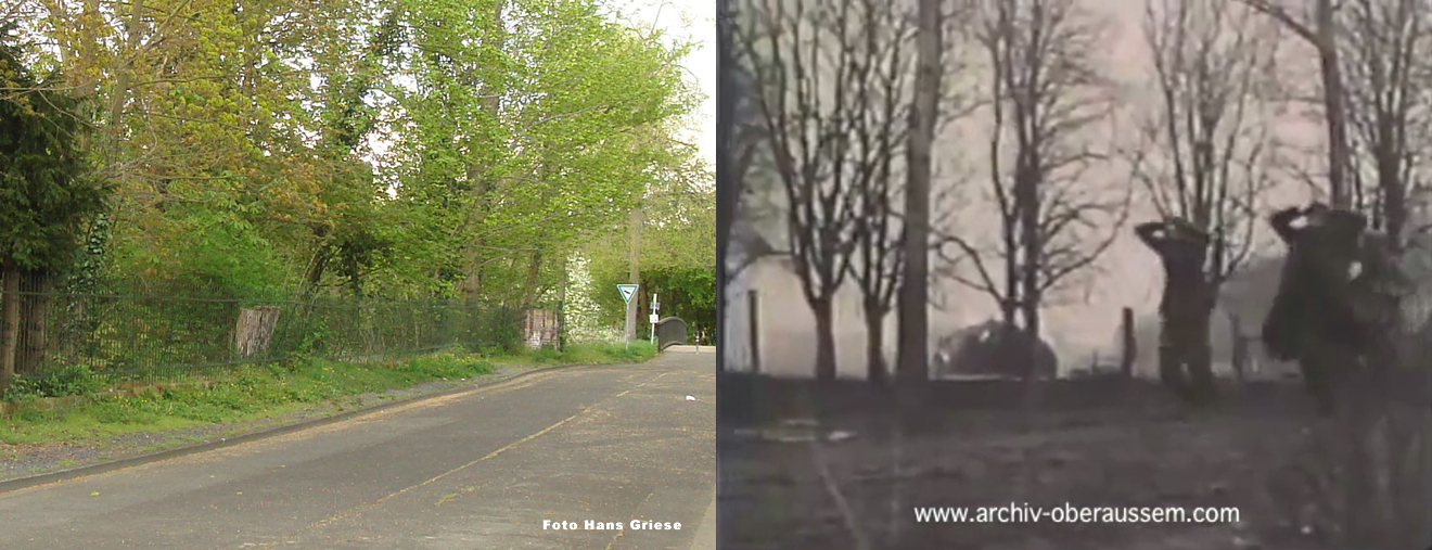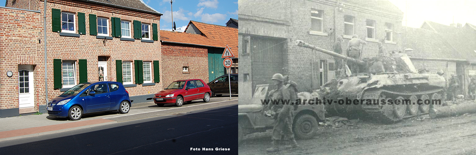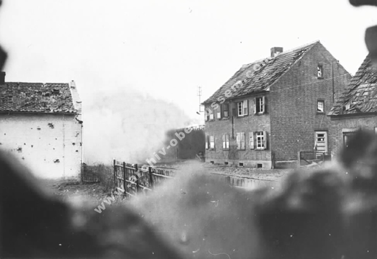 Wir lagen eingegraben an der Ostseite von Oberaußem im Abstand von 60 - 80 Metern in Schützenlöchern und hörten die Panzer in Oberaußem reinfahren. Nachts wurde Hauptmann Buer ( II./GR 957 ) bei einem Erkundungsvorstoß in Oberaußem verwundet und gefangen genommen. Da es keine Nachrichtenverbindung gab, lief ich um Mitternacht, als es etwas ruhiger geworden war, zum Regimentsgefechtsstand nach Gut Neuhof, westlich Glessen zurück und holte Oberleutnant Feuerberg nach vorn, der dann die Führung des II./GR 957 übernahm. Am Morgen des 3. März 1945, gegen 04:30 Uhr griffen im dichten Nebel die amerikanischen Panzer aus Oberaußem an. Eine erfolgreiche Gegenwehr war nicht möglich, da auf jedem Panzer 12 - 18 Amerikaner “hingen“. Unsere Abwehrlinie kurz hinter Oberaußem Richtung Büsdorf wurde einfach durchfahren und der Rgt. Stab mit Oberst Freiherr von Gall überrascht und gefangen genommen. Ich selber irrte im Nebel umher, um unsere Leute zu sammeln, fand dann auch meinen Adjutanten mit einigen Männern wieder, als sich der Nebel zu lichten begann.