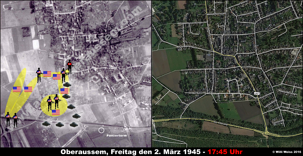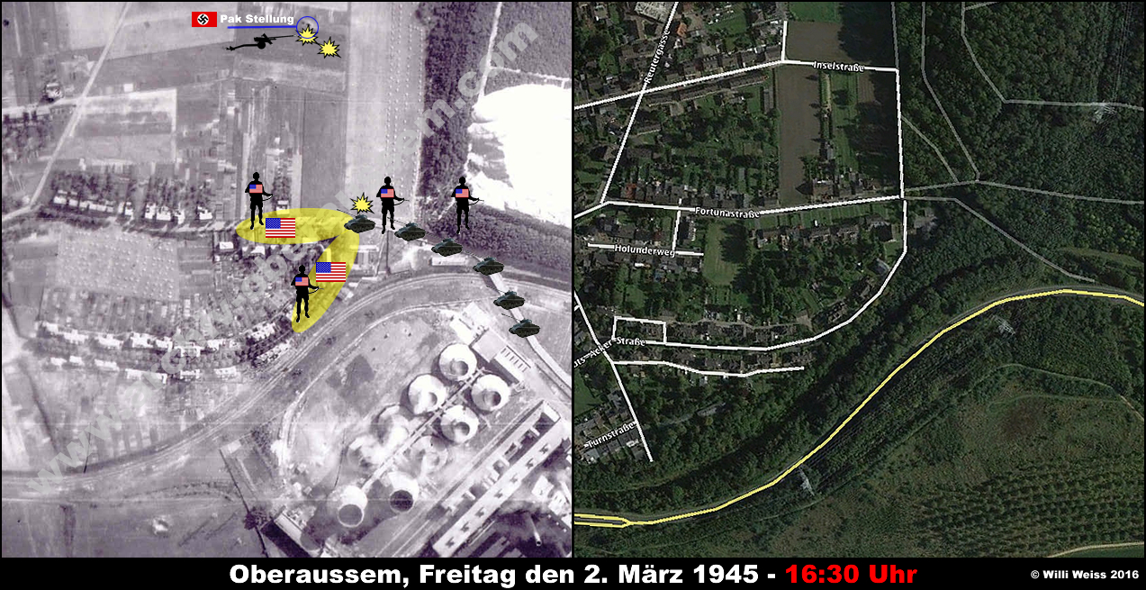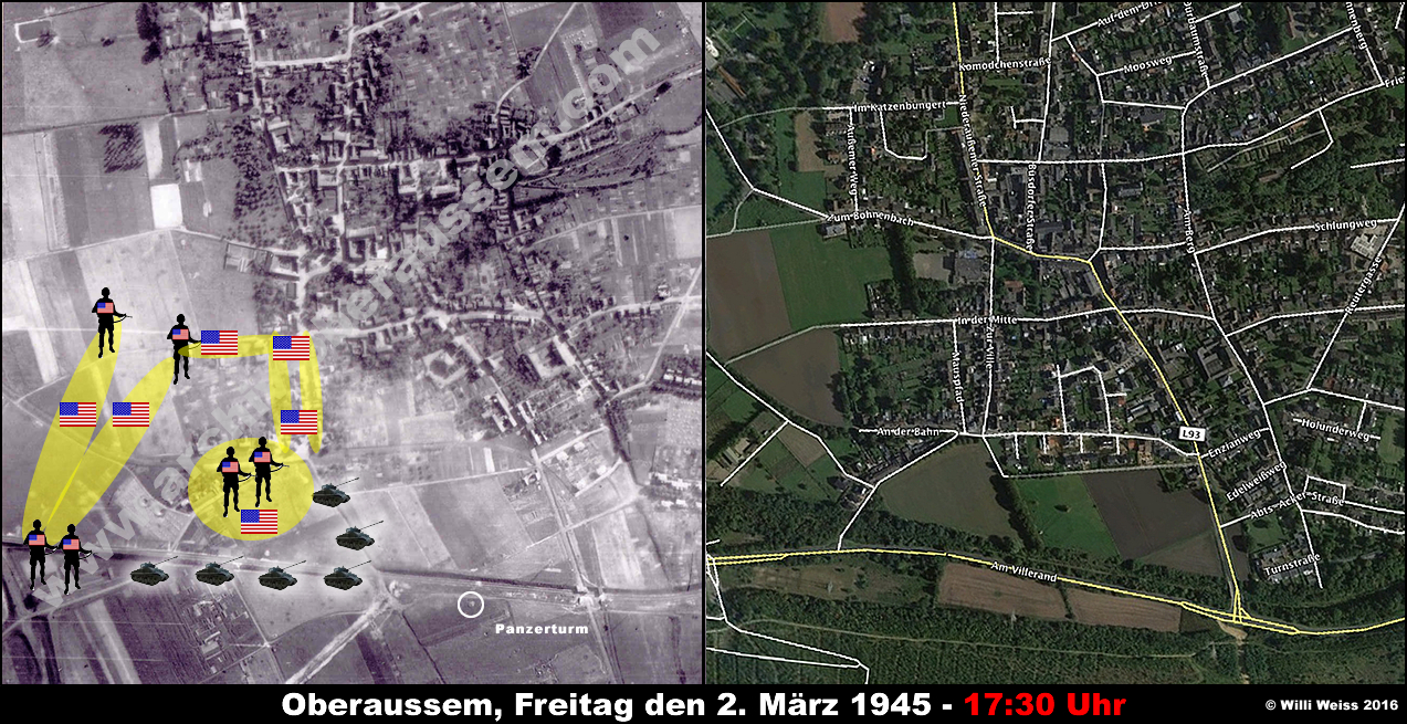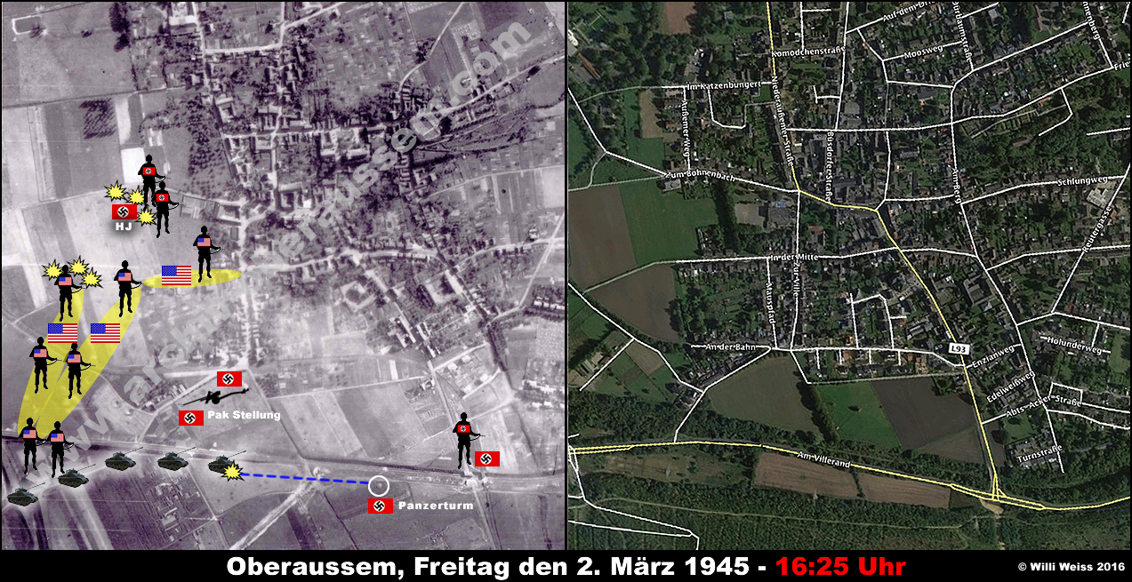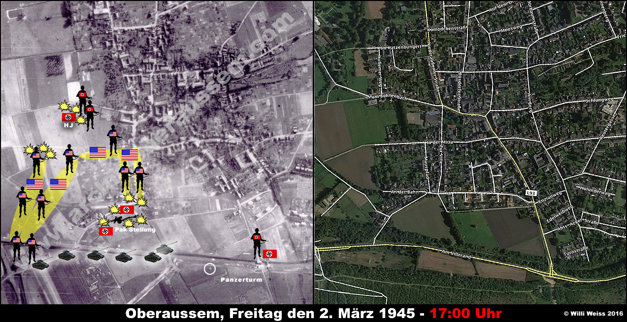 Zu diesem Zeitpunkt hatte die von der Hindenburgstrasse (heute Abts-Acker-Strasse) kommenden Teile des 1st Bn., 36th Armd. Inf. Regt. die gesprengten Brücken vor Oberaussem erreicht. Die Bewacher hatten sich widerstandslos ergeben und wurden später verhört.