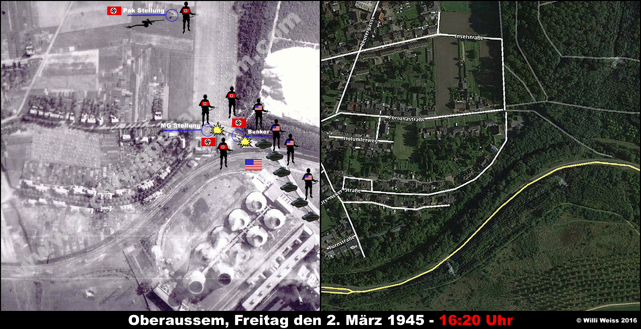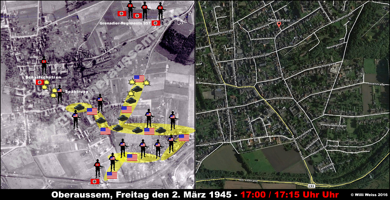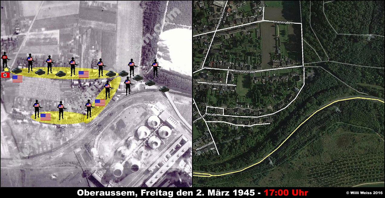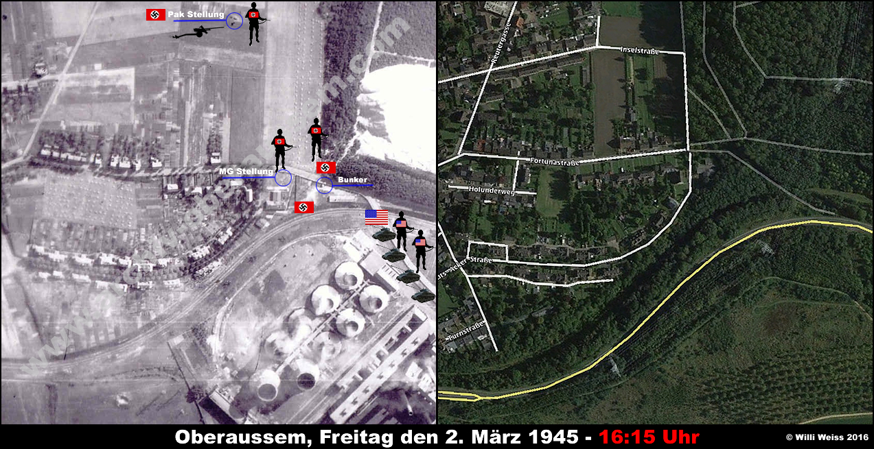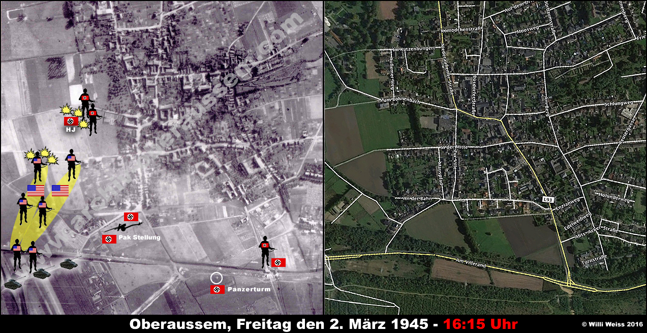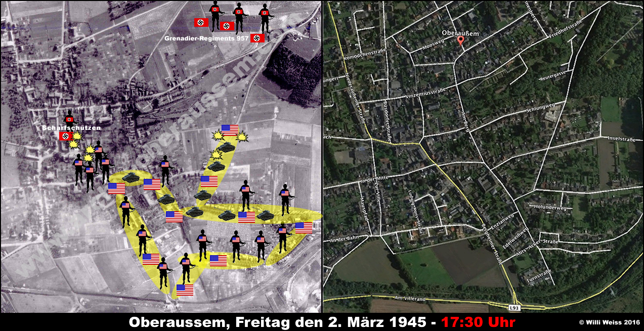 Zu diesem Zeitpunkt hatte die von der Hindenburgstrasse (heute Abts-Acker-Strasse) kommenden Teile des 1st Bn., 36th Armd. Inf. Regt. die gesprengten Brücken vor Oberaussem erreicht. Die Bewacher hatten sich widerstandslos ergeben und wurden später verhört.