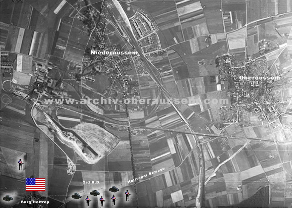 Um 11:00 Uhr (2. März 1945) erreichten zwei Kompanien des 36th AIR / 3rd AD mit fünf Medium Tanks, von der Burg Holtrop kommend, den Ortsrand von Niederaussem im Bereich der heutigen Holtroper Strasse / Barbarastrasse.