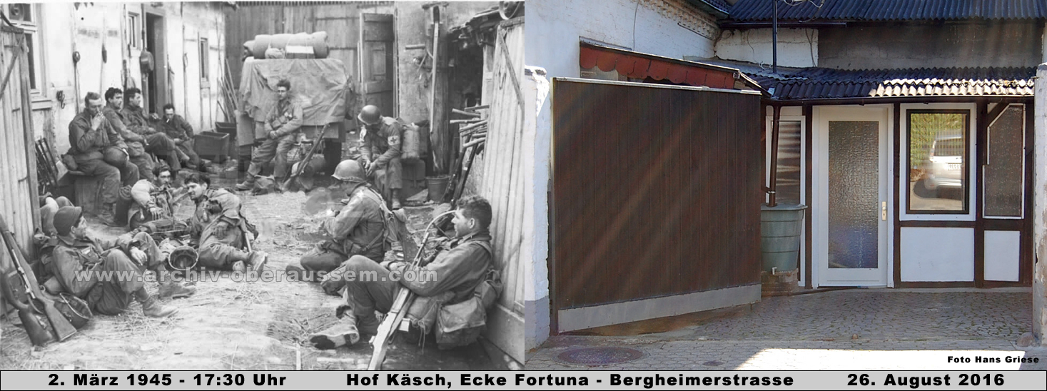 Etwa um 17:30 Uhr wird der Vormarsch, zu dieser Zeit etwa auf Höhe der damaligen Schneiderei Kremer, Fortunastrasse, gestoppt. Die Spitze der Infanterie hat den Hof Käsch, Ecke Fortunastrasse / Bergheimer Strasse erreicht und legt, zwangsläufig, eine Marschpause ein. Die etwas weiter zurückliegenden Truppen sammeln sich auf dem Gelände des Abtshofes. Somit steht die gesamte Fortunastrasse, ab dem Abzweig Am Rott, voller stehender, amerikanischer Fahrzeug.