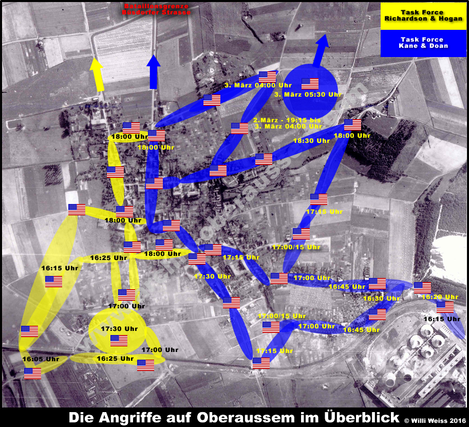 In Oberaussem war als amerikanische Bataillonsgrenze (TF Richardson und Hickey sowie der TF Doan und Kane) die Büsdorfer Strasse (von der Ortsmitte, also Dränk (Theodor-Bondü-Platz), bis zum Ort Büsdorf) festgelegt worden. Über die Büsdorfer Strasse rückten die Amerikaner, vom KW Fortuna, über die Fortunastrasse, Bergheimer Strasse kommend, über die Hauptstrasse vor.