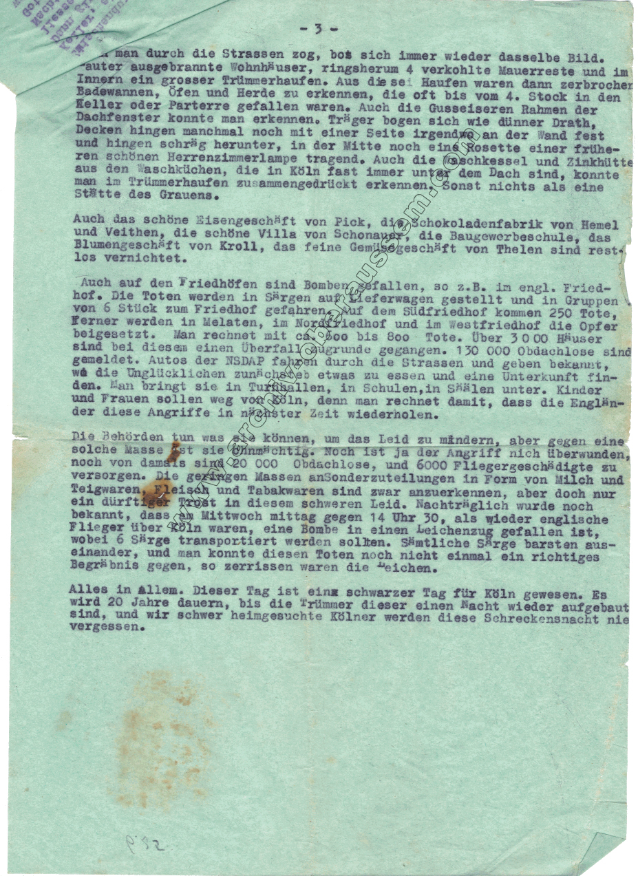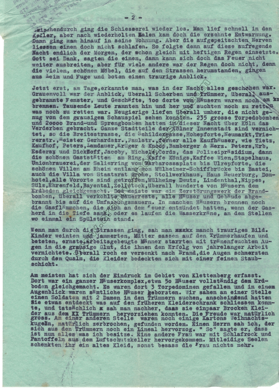 „15. Oktober (Sonntag): Mit den Angriffen wird es immer schlimmer. Gestern Morgen um ½ 6 Uhr war ein Angriff auf Köln. Alarm kam erst, als fast alles vorbei war.