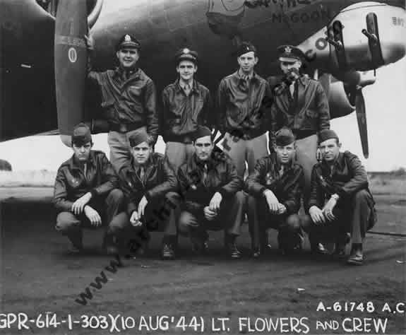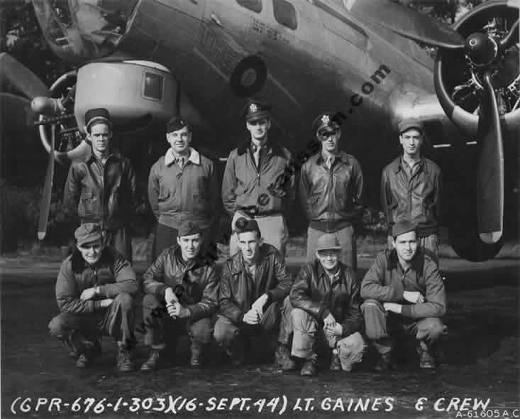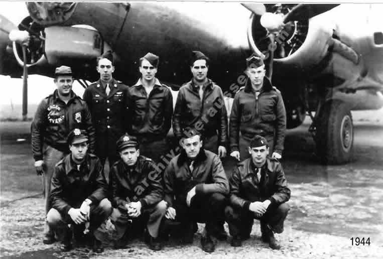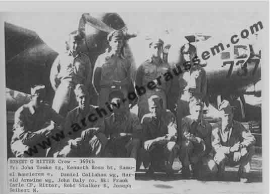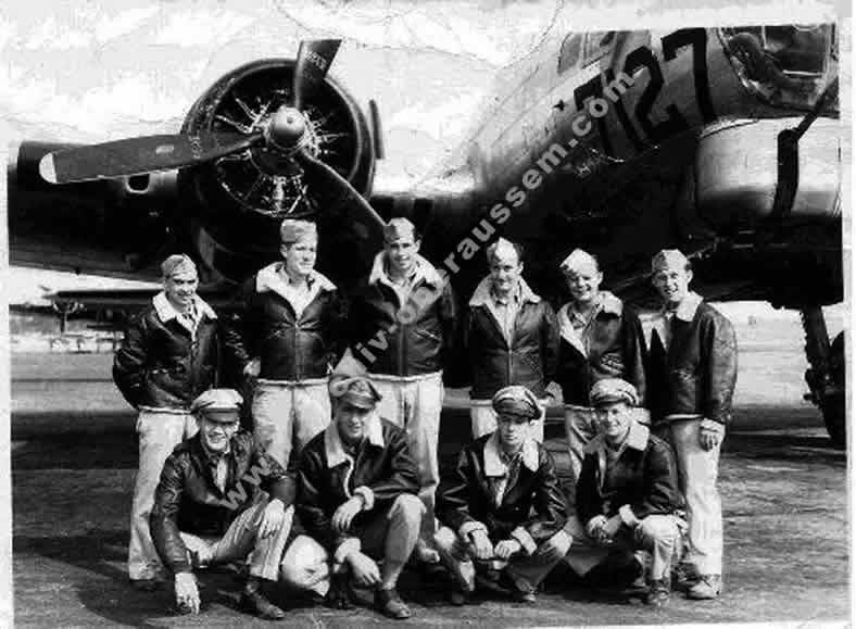 | Der unten im Report angegebene Zeuge 1st Lt. Robert J. Scolnik, unten – zweiter von links, mit seiner Besatzung. Sie haben die Maschine von 2nd Lt. Robert G. Ritter zum letzten mal über Köln gesehen. |
