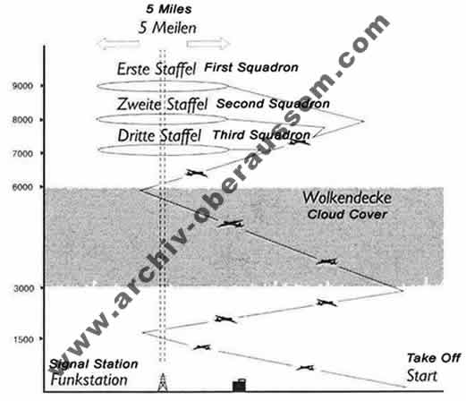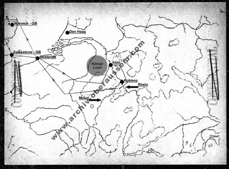 | Anflug der Maschine über Köln-Niehl nach Köln-Flittard wo der Abschuss erfolgte. Abdrehen der Maschine in Richtung Opladen, ein nochmaliges Abdrehen in Richtung Sinthern / Geyen bis zum Absturz in Königsdorf. |
