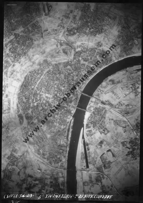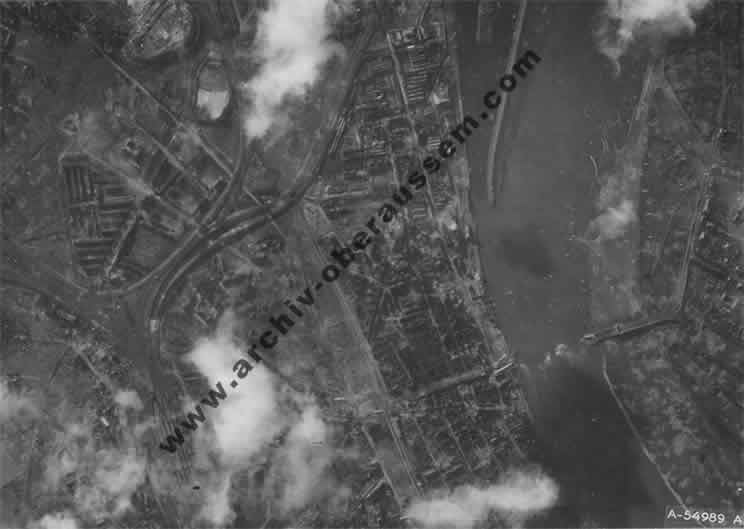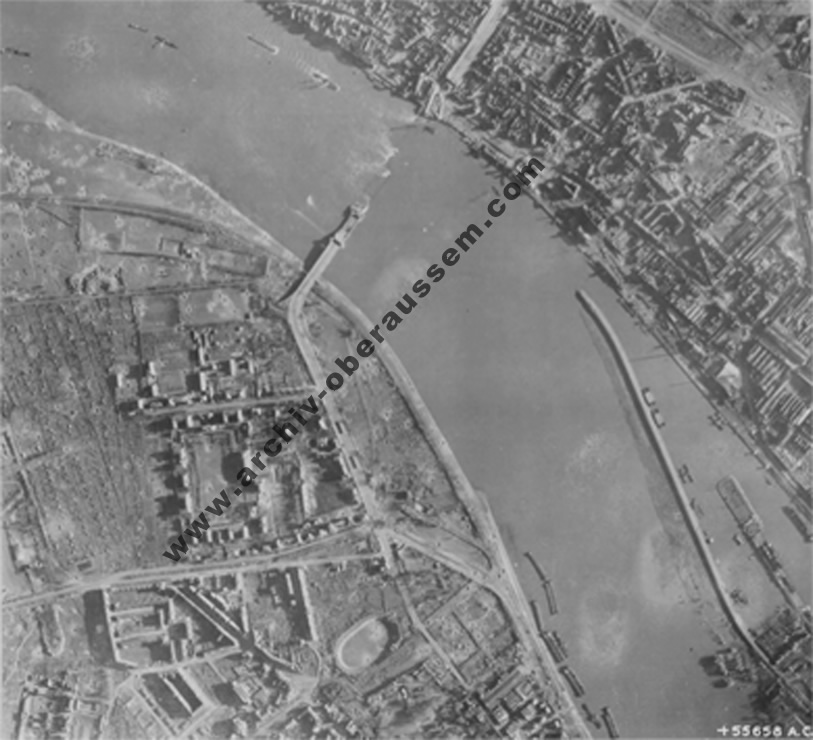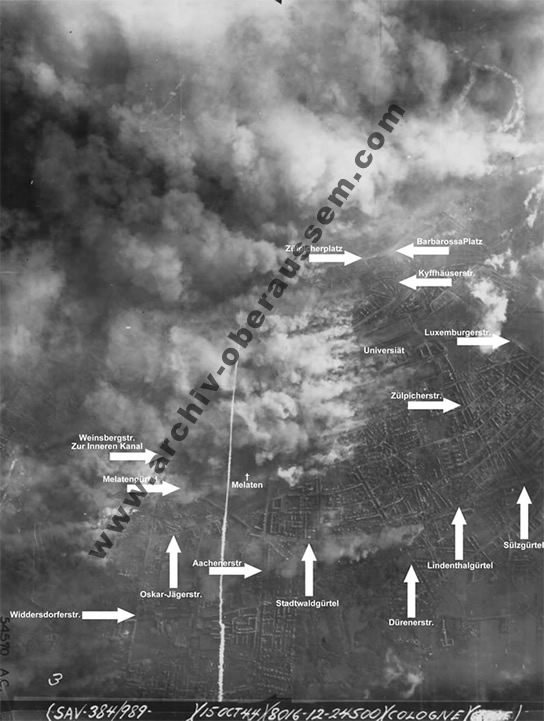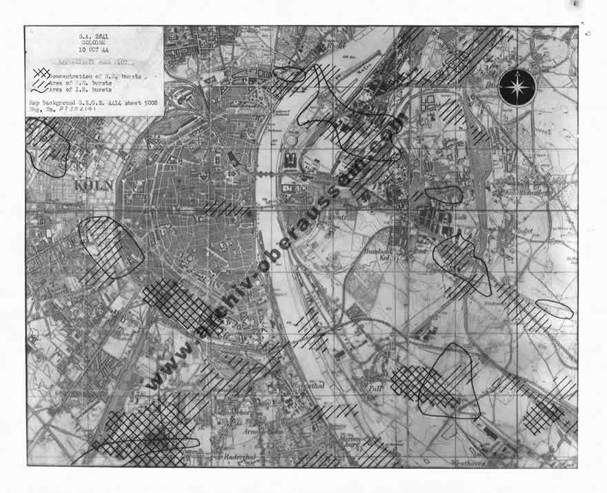 | Amerikanische Luftaufnahme vom 15. Oktober 1944. Blickrichtung von Köln-Braunsfeld in Richtung Rhein. |
