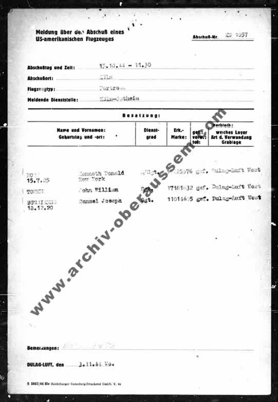 Last Knows : 15. Oct. 1944 / 0938 at Cologne – Lost : Enemy Anti-Aircraft