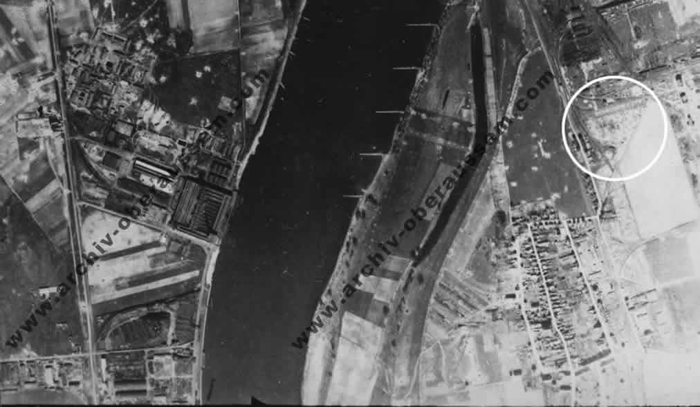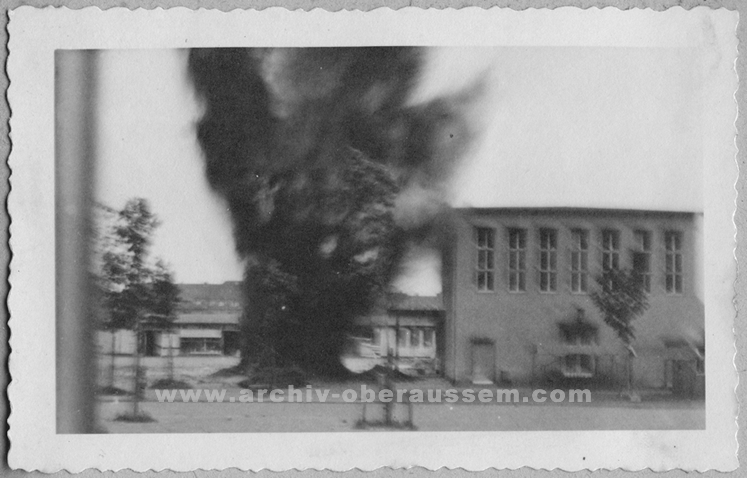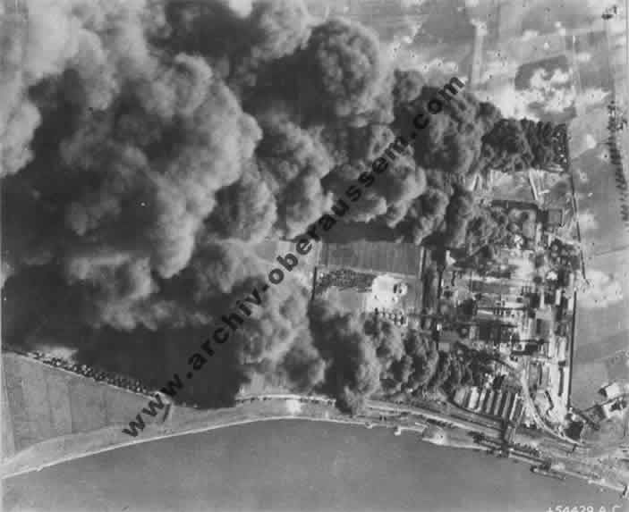 | Die Raffinerie in Monheim während des Bombenangriffs – das letzte Ziel des Bombers. |