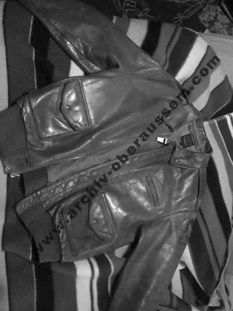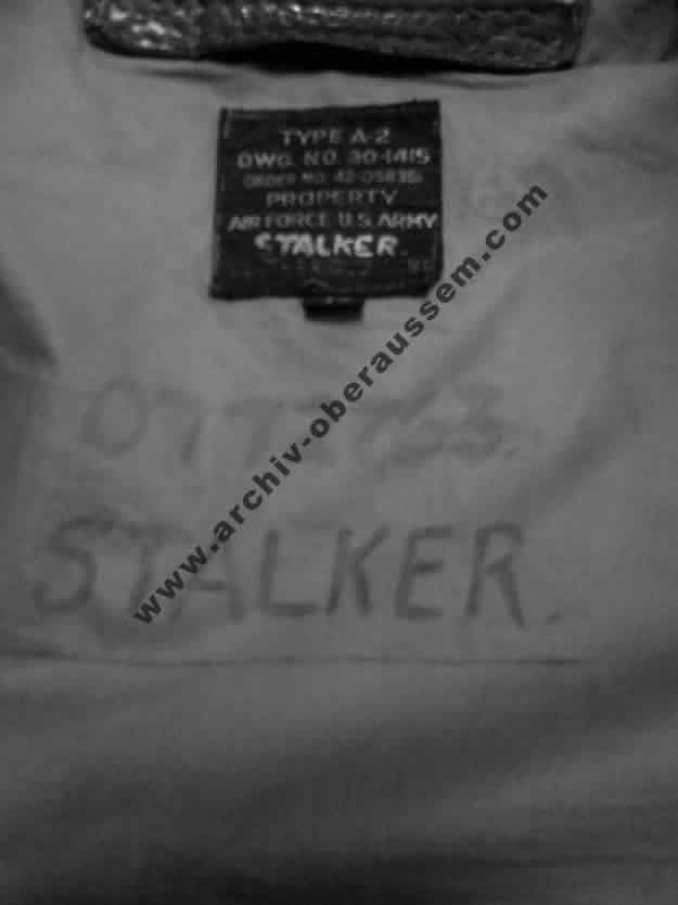 | Die Lederjacke vom „Nose Gunner“ 2nd Lt. Robert A. Stalker. Sie wurde nach dem Tod, zusammen mit seinen Sachen von England zu den Angehörigen in die USA gesendet. |