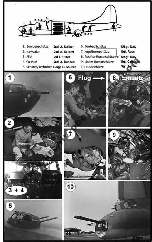 Unter diesen angreifenden Bombern befand sich an diesem Tag auch die Boeing B-17, Flying Fortress - Fliegende Festung, von Pilot 2nd lieutenant (Leutnant) Robert G. Ritter aus New York mit seiner Mannschaft. Sie hatten den Auftrag, Köln und die Raffinerie in Monheim, nördlich von Köln, zu bombardieren. Die Maschine schwenkte ab in nördlicher Richtung als der Nose Gunner, der auch die Funktion des Bombardier übernahm (Positionen der Besatzung auf Seite … ) meldete „ Flak at 12 O'Clock - Flak auf 12:00 Uhr ! “. Dies waren die letzten Worte vom Navigator, so die späteren Aufzeichnungen der Überlebenden. Buchteile von Sekunden vergehen, als die vordere Kanzel - „Nose“ genannt - um 09:38 Uhr einen Volltreffer von der Flak in Köln-Flittard erhielt und den Navigator 2nd lieutenant (Leutnant) Joseph A. Seibert und Nose Gunner und Bombardier, 2nd lieutenant (Leutnant) Robert A. Stalker mit in die Tiefe riss. Zwei Motoren wurden getroffen, wichtige Teile der Maschine vielen aus.