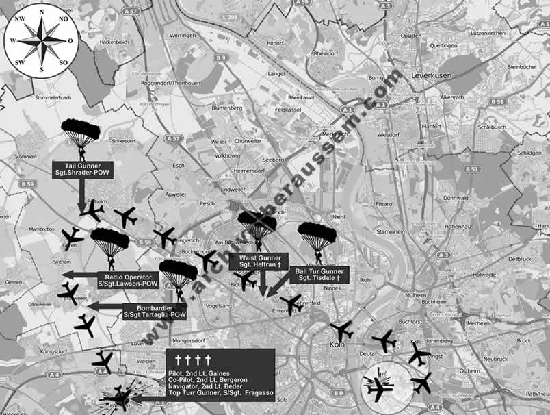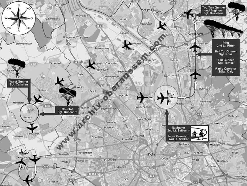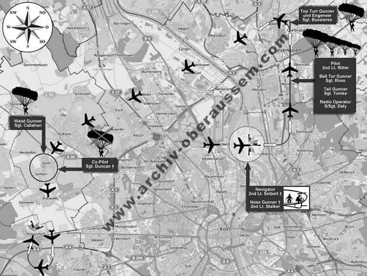 Die stark beschädigte Maschine, nun kaum noch durch den Piloten zu kontrollieren, bewegte sich in nördlicher Richtung auf Opladen zu. Die Besatzungsmitglieder 2nd lieutenant Robert G. Ritter (Pilot), S/Sgt. John J. Daly (Radio Operator), Sgt. Kenneth D. Ross (Ball Turr Gunner) und Sgt. John W. Tomke (Tail Gunner) sprangen mit dem Fallschirm zwischen Köln-Flittard und Opladen durch die Mitteltür der Maschine ab - einige Sekunden später verließ auch S/Sgt. Samuel J. Bussieres (Top Turr Gunner) über Opladen-Wiesdorf durch die Mitteltür der Maschine. S/Sgt. Samuel J. Bussieres landete unverletzt in Opladen-Wiesdorf und wurde dort zur Polizeiwache gebracht.