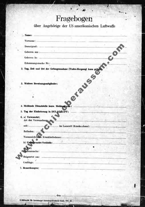 | Fragebogen über Angehörige der US amerikanischen Luftwaffe. Dieser musste von den Überlebenden ausgefüllt werden. |