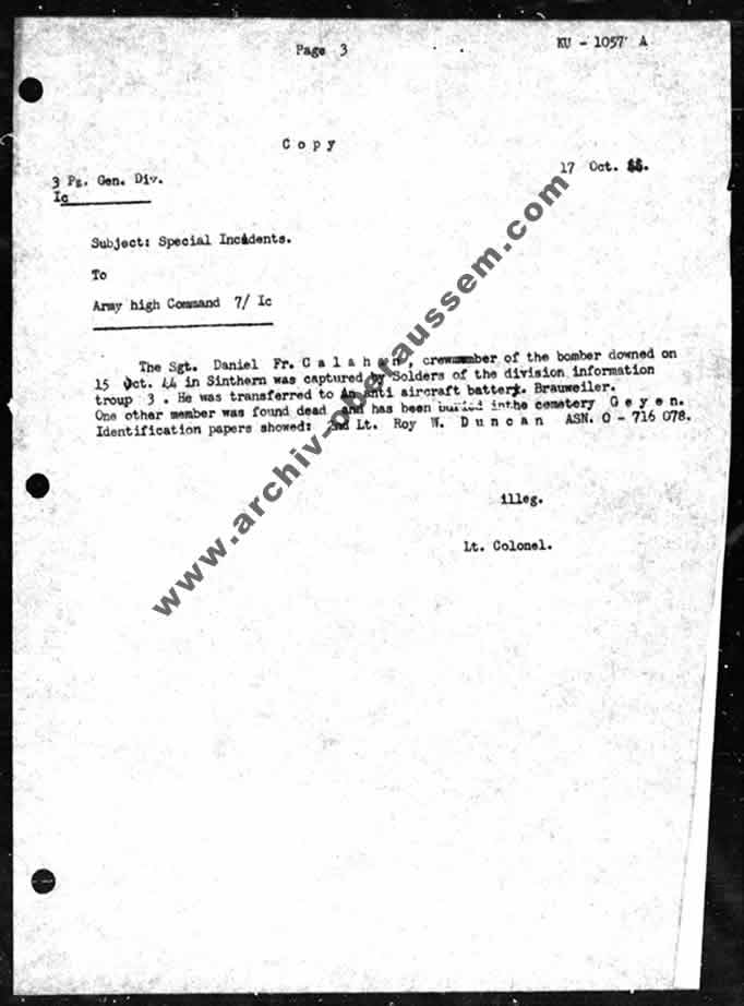 | Meldung der 3. Panzer-Grenadier-Division über die Festnahme von Sgt. Danile F. Callahan sowie über das Auffinden von 2nd Lt. Roy W. Duncan. |