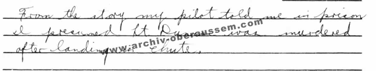 „Die Maschine verlor weiter an Höhe. Wir liefen beide zur Seitentür. Ich stieg aus, löste den Fallschirm aus. Wie in einem Aufzug wurde ich nach oben katapultiert. Unmittelbar danach hatte auch der Co-Pilot, 2nd lieutenant Duncan, das Flugzeug verlassen. Da ich aus irgendeinem Grund bedeutend höher in der Luft war als er, konnte ich noch beobachten wie er aus der Tür sprang. Dann schepperte es laut, Dachziegeln flogen mir um die Ohren. Ich war auf einem Dach gelandet. Unten stand eine aufgebrachte Menge Leute, die zu mir rauf schrie. Ich hatte furchtbare Angst, denn einige Leute zeigten mir in, für mich eindeutige Gesten, das sie mich umbringen wollten. Immer wieder hantierten sie mit allerlei bedrohlich wirkenden Werkzeugen in meine Richtung. Mir kam es vor wie eine Ewigkeit die ich auf dem Dach verbrachte. Immer mehr Menschen versammelten sich im Innenhof. Plötzlich schien sich die Stimmung der Leute umzudrehen. Männer brachten eine Leiter und deuteten mir, ich soll runter kommen vom Dach. Ich löste meine Fallschirmgurte und kletterte, am ganzen Körper zitternd, die Leiter runter. Um mich versammelten sich Leute die mich scheinbar beschützen wollten. Andere drohen weiter mit allerhand Geräten zu mir rüber. Ich wurde in eine Haus gebracht und man deutete mir ich solle mich setzen. In diesem Moment kamen deutsche Soldaten, das Gewehr im Anschlag, und gaben mir zu verstehen, dass ich die Hände hoch heben sollte. Ein zweiter, noch sehr junger Soldat, durchsuchte mich nach Waffen und nahm mir meine Papiere ab. Nun wurde ich zu einem Fahrzeug geführt. Ich musste mich hinten in das Fahrzeug setzten, mein Bewacher saß hinter mir auf dem geöffneten Verdeck. Immer noch das Gewehr im Anschlag. Der Fahrer bahnte sich seinen Weg durch die Menschenmenge.“