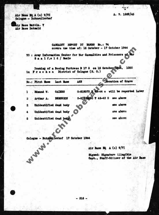 Hierbei handelte es sich um den Radio Operator S/Sgt. Lucien P. Lawson. Er befand sich in der Maschine von 2nd Lt. Edmund W. Gaines, die einige Minuten später in Frechen abstürzte. Siehe hierzu das nachfolgende Kapitel.