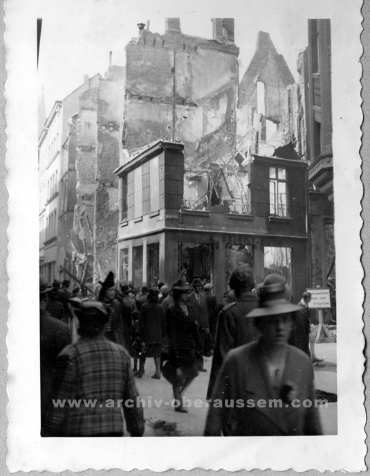„Sonntag, 15. Oktober 1944, Morgens 8 ¼ Uhr Fliegeralarm. Wir sind im Keller der Kirche, schrecklich prasseln die Bomben herunter. In unmittelbarer Nähe, zuletzt ein Menge von Brandbomben. In einer Pause sehen wir, dass ein Haus und die Kirche noch stehen. Nachher aber finden wir eine Reihe von Brandbomben in der Kirche. Ein Holzstoß brennt. Ebenso das Dach des Kölner Hofes. Dann der große Ostturm in der Dachverschalung. Eine Sprengbombe vor der Kaplanei. Dann gehe ich mit Mater Angela durch die Pfarre. Die Eisenbahnüberführung in der Marzellenstraße liegt zur Hälfte auf der Straße. Es brennt in der Maximinen-, Allerheiligen- und vor allem in der Machabäerstraße. Dann in der Jakorden- und Brandenburger Straße. Viele Leute aus der Pfarre sind obdachlos. Auch in der Domstraße brennen einige Häuser. Eine Brandbombe liegt vor dem Haus Domstraße 20 bei Hauke.